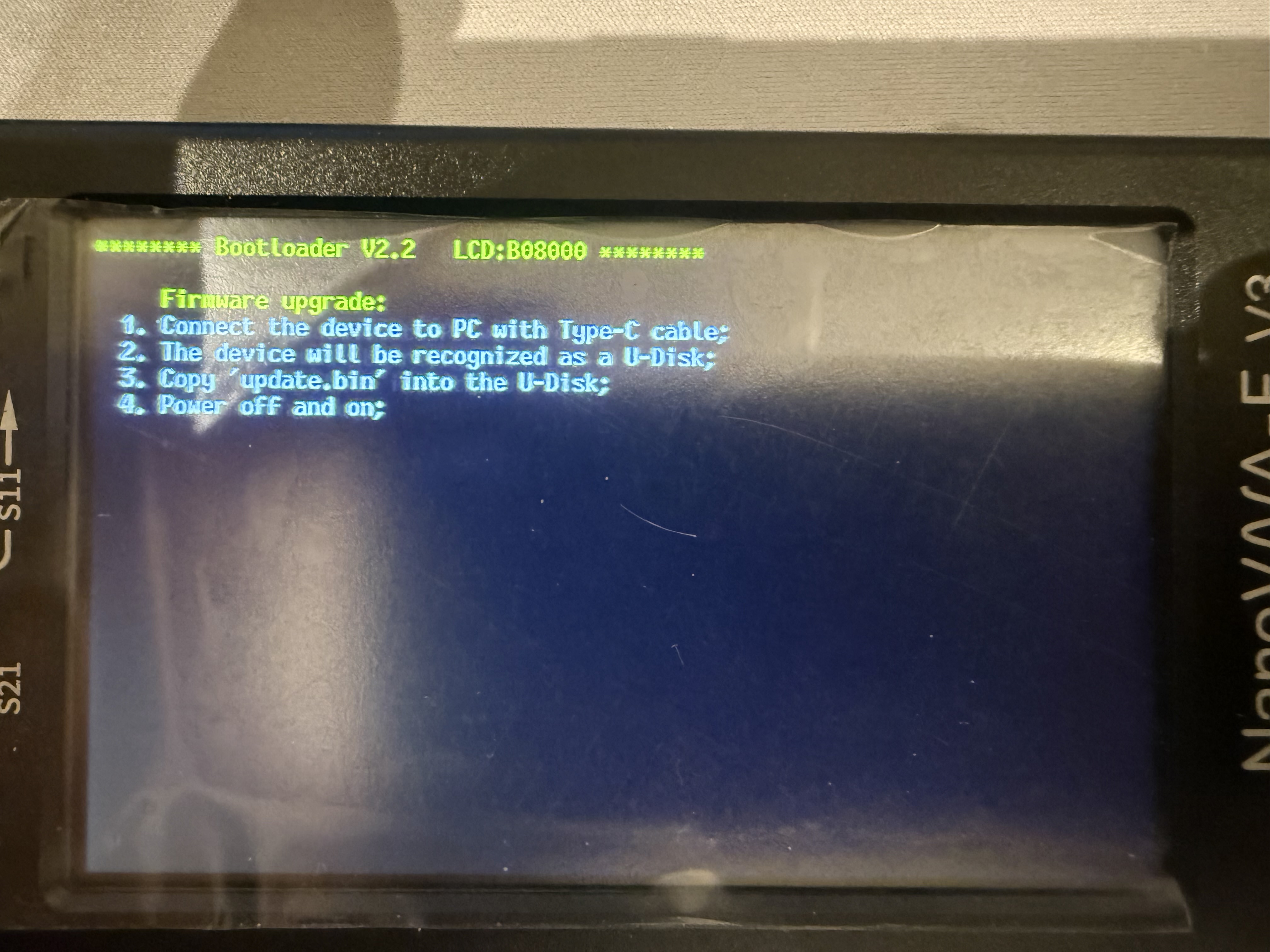 Der Firmware Update wird durchgeführt, indem man beim beim Einschalten den miitleren Button am Gerät gedrückt hält. Das Gerät wird dann als U-Disk (USB-Laufwerk) erkannt und man kopiert dann das neue Firmware-File in den Hauptordner dieses USB-Laufwerks. Danach wird das Gerät ausgeschaltet und wieder eingeschaltet und startet mit der neuen Firmware.